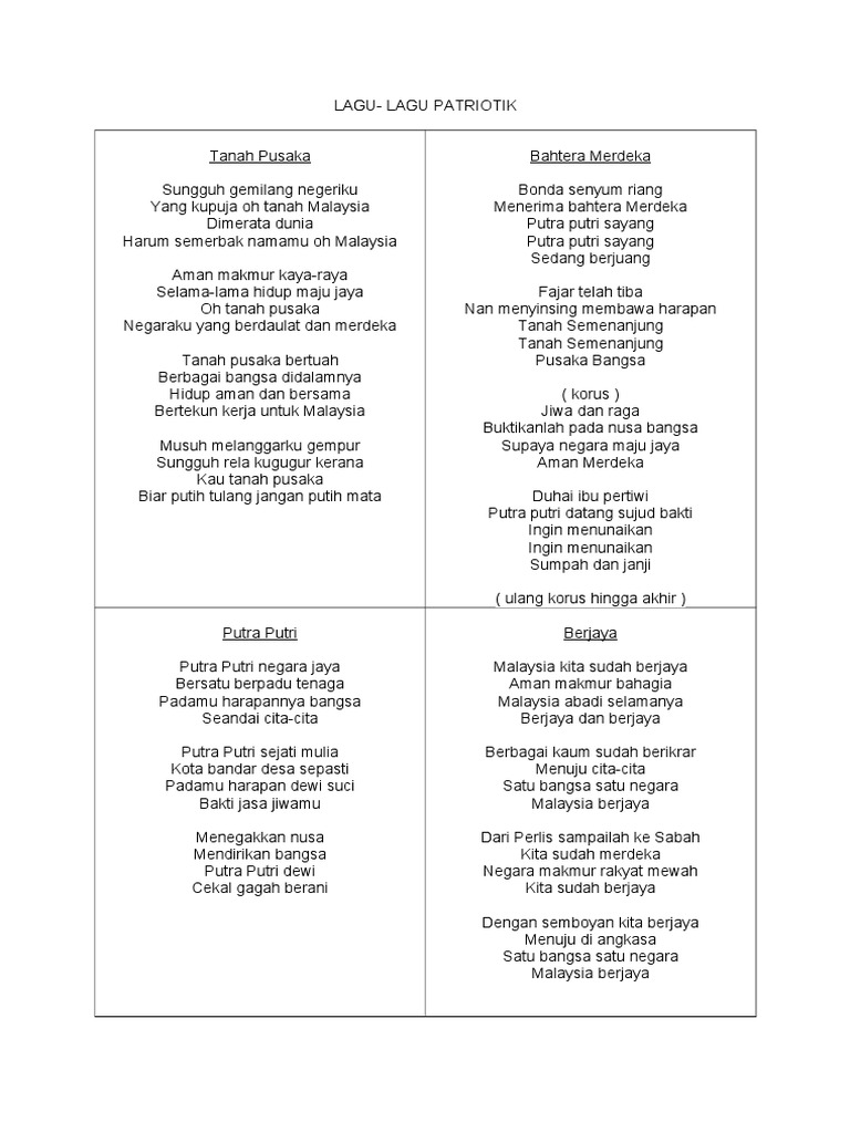 Melayu jika dilihat dari sudut era sebelum 1963 dengan meneliti dua lagu patriotik popular tempatan iaitu Sekapur Sireh Seulas Pinang 1956 dan Tanah Pusaka 1964. Lirik Lagu Tanggal 31 Ogos Sudirman. Lirik Lagu Tanggal 31 Istimewa untuk anda hari ini kami akan kongsikan senarai lagu patriotik Malaysia yang wajib dihafal oleh semua anak Malaysia.